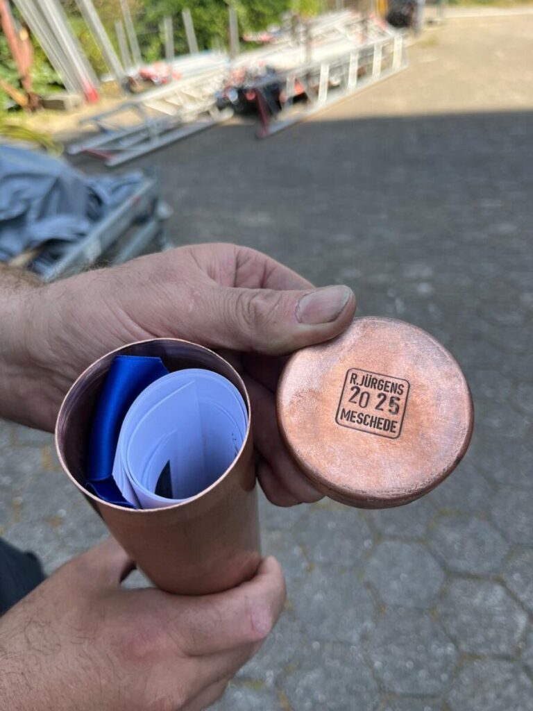 Ein Job für Rafael Jürgens und seine Kunstschmiede in Meschede. Denn so einzigartig das Projekt für die Wattenscheider Pfarrei ist, so alltäglich ist der Umgang mit solchen Turmkreuzen für Jürgens: „Wir arbeiten häufig mit der Firma Prange zusammen.“ Denn wo ein Schieferdach ist, ist oft auch ein Metallkreuz. In fünf Wochen hat Jürgens das historische, deutlich mehr als mannshohe Gestell aus Wattenscheid in seiner Werkstatt bearbeitet. Jetzt sind die alten, von 160 Jahren Geschichte hoch über dem Ruhrgebiet gezeichneten Kreuzbalken ebenso zu erkennen wie die neuen, glatten Elemente, die der Kunstschmied hinzugefügt hat. Ein neuer Schaft aus Edelstahl soll zudem dafür sorgen, dass die Konstruktion möglichst lange stabil über dem Kirchenschiff steht. So lange, dass die Projektgruppe in die Kugel unter dem Kreuz sogar eine Zeitkapsel eingefügt hat. „Da haben wir eine Plakette unseres taufpastoralen Zentrums und einen Brief eingefügt, in dem wir über die aktuelle Situation schreiben“, sagt Knepper, über die Lage der Welt, die größten Ängste der Menschen in Wattenscheid, die Situation der Kirche… Auch die Sorge vieler Menschen vor einem wachsenden Rechtsextremismus hätten sie in der Zeitkapsel dokumentiert. Die Hoffnung der Pfarrei: Die Welt möge sich zu einer besseren entwickeln.